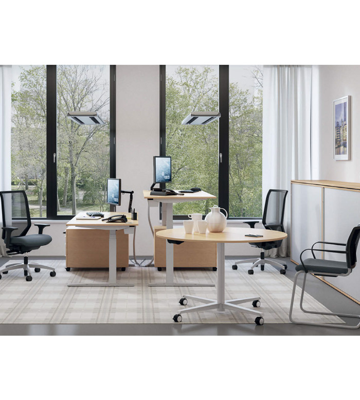 Rondo linija miz nudi mize za delo stoje ali mize za delo stoje in sede.
