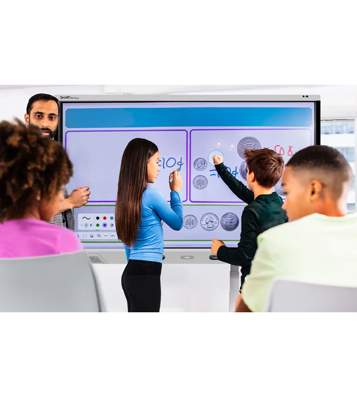 iQ 4 omogoča enostavno povezovanje mobilnih naprav učencev z učnimi vsebinami ter nadzor sodelovanja in navigacije – vse brez potrebe po računu in brez zapuščanja interaktivne table.